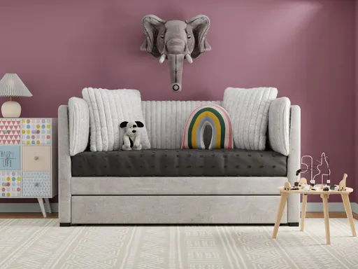 The Manhattan Daybed with Trundle offers a stylish and versatile solution for your guest room, kids' room, or living space. Available in Twin or Full size, this daybed features a hidden twin trundle beneath, making it ideal for accommodating overnight guests or maximizing space in smaller rooms. Upholstered in a luxurious gray faux fur corded fabric reminiscent of corduroy, the Manhattan Daybed exudes modern comfort and charm. Its plush texture is both inviting and durable, while the included throw pillows add an extra touch of coziness and style. The daybed’s design eliminates the need for a foundation, ensuring a streamlined and practical setup. Perfect for lounging during the day and sleeping at night, the Manhattan Daybed with Trundle combines functionality, comfort, and contemporary aesthetics to elevate your space.