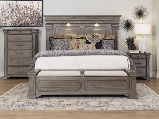 The Mansion Bed is a grand and luxurious centerpiece for your bedroom, offering both style and functionality. Available in King or Queen sizes, this bed is crafted with precision using hardwood solids and birch veneers, presenting a sturdy and elegant frame finished in a transparent grey tone. The detailed framed headboard and footboard showcase intricate craftsmanship, creating a visually striking focal point in your bedroom decor. Adding a modern touch, the headboard is equipped with LED lights and USB ports, providing convenient and ambient lighting as well as a charging station for your devices. One of the standout features of the Mansion Bed is the footboard, which features upholstered seats with storage underneath. This thoughtful design not only enhances the bed's aesthetic appeal but also provides practical and additional storage space. Elevate the sophistication of your bedroom with the Mansion Bed, a perfect blend of form and function.