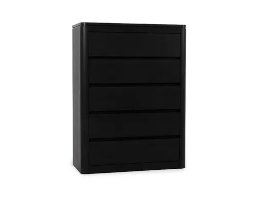 The May Chest brings sleek, modern storage to your bedroom with a focus on clean lines and thoughtful construction. Made from engineered wood and MDF, this black five-drawer chest features a minimalist design with no visible hardware. The front two edges are gently rounded, creating a soft visual transition from front to side that adds a subtle touch of refinement. Its streamlined silhouette makes it a versatile fit for a variety of modern or transitional spaces.