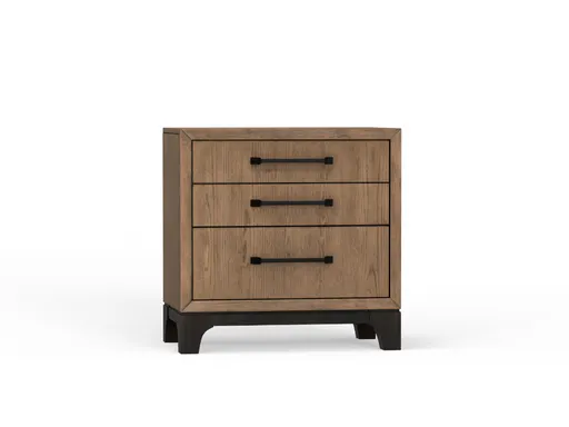 The Meade Nightstand blends rustic texture with modern functionality, offering stylish bedside storage with thoughtful features. Crafted from rubberwood solids and veneers, this three-drawer nightstand features a light gray wash that enhances the natural brown wood grain, adding warmth and depth to your bedroom. Black hardware and a black base create a striking contrast, complementing the nightstand’s clean lines and modern edge.