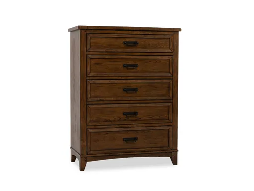 The Meridian Chest is a stylish storage solution that combines clean design with warm, natural appeal. Finished in a rich honey tone, this chest is crafted from oak solids and veneers, bringing durability and beauty to your bedroom. Its simple silhouette and black hardware provide a modern contrast to the wood's natural grain, making it a versatile piece that complements both contemporary and traditional decor. With five spacious drawers, the Meridian Chest offers ample room to keep your wardrobe organized and your space clutter-free.