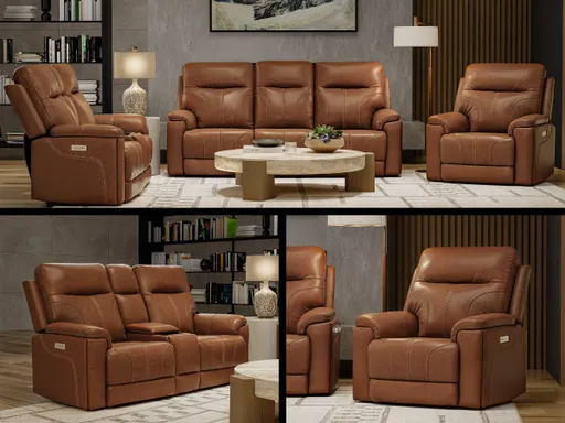 The Music Theater Sofa, Loveseat, and Recliner Set offers the ultimate in luxury home entertainment seating, combining top-tier comfort with advanced technology across three beautifully coordinated pieces. Available in Almond (a warm brown) or White (a very light gray), each piece is upholstered in soft top grain leather with a vinyl match on the sides and back for durability. Whether you're watching movies, listening to music, or simply relaxing, this set brings high-performance features to your living space with style.