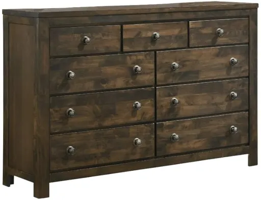 The Blue Ridge 9-Drawer Dresser by New Classic Furniture epitomizes eco-friendly sophistication. Crafted from reclaimed solid wood sourced from various origins, this dresser embodies environmental responsibility and sustainability. The naturally timeworn appearance, showcasing unique traits like nail and bolt holes, bug holes, water and mineral staining, checking, and open knots, ensures each piece's distinctiveness.