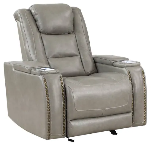 The Breckenridge Genuine Leather Power Glider Recliner with Adjustable Headrest in Gray offers a perfect blend of comfort, style, and practicality for any living space. This recliner is crafted with a combination of hardwood and manufactured woods, ensuring a durable and sturdy frame that provides long-lasting support.