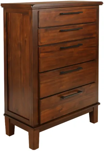A bedroom suite that beckons you to linger longer with a good book or your morning coffee, the Cagney chest with five storage drawers in tapered leg. Crafted of distinctive Acacia wood, the grain, and natural wood colors lend to the unique look of this bedroom.