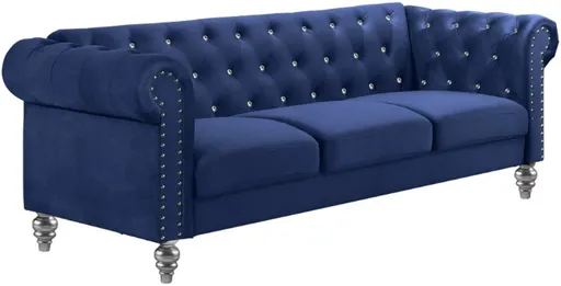 The Emma Sofa is a blend of soft elegance and sophisticated design. Crafted from 100% polyester velvet fabric, it offers cozy and indulgent seating for three. The glam tailoring features tufted backs and arms adorned with glimmering crystal buttons, adding a touch of luxury without compromising comfort.