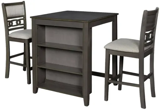 The small space friendly Gia Counter Storage Table and Chair Set has a built-in shelf unit that provides the ideal spot for dinnerware or kitchen essentials. The dining table and chair legs are crafted of solid Rubberwood to add strength and stability.