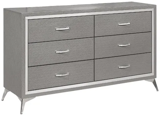 The Huxley 6-Drawer Dresser in gray combines contemporary glam with durable craftsmanship, making it a stylish and functional addition to your bedroom. The inviting gray finish provides a sleek, sophisticated look that complements contemporary interiors, creating a calming atmosphere.