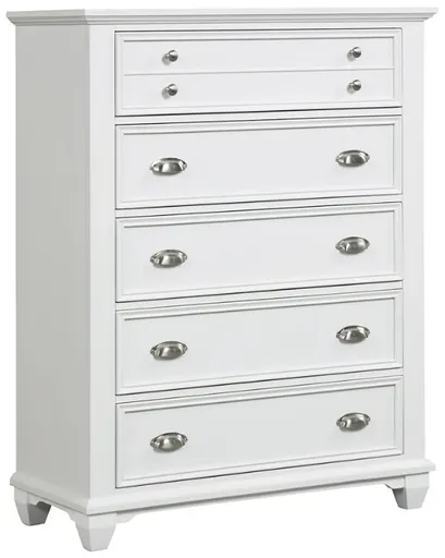 The Jamestown 5-drawer chest in white is a perfect blend of durability, style, and functionality, making it a valuable addition to any bedroom. Expertly crafted from solid Acacia, premium manufactured woods, and authentic Oak veneers, this chest is built to last while preserving the natural elegance of real wood.