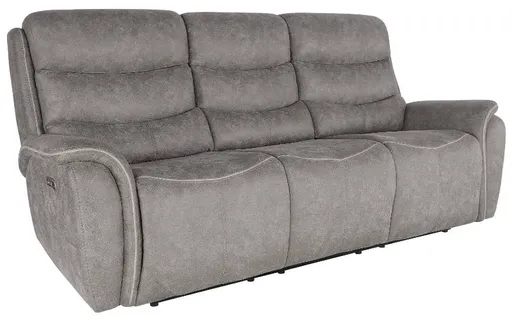 Experience the epitome of comfort and style with the Kamari Reclining Sofa with power headrests and footrests in gray. Immerse yourself in the plush, suede-like softness of its dappled gray upholstery, meticulously crafted from a blend of polyester and PU fabric.