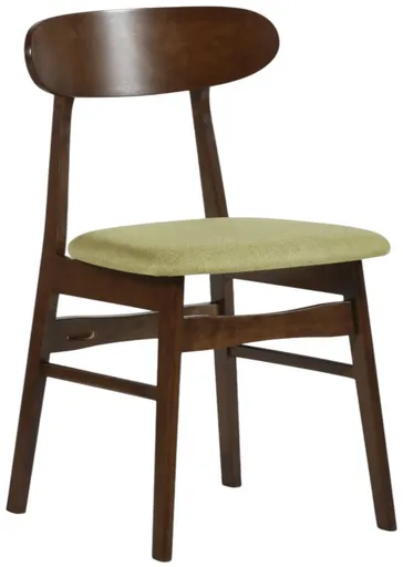 The New Classic Morocco Dining Chairs are a picture of Mid-Century Modern design with tapered legs, curved oval seatbacks, and classic walnut brown color. Easy care, green 100% polyester foam cushions provide comfortable seating. A perfect accent chair in any room.