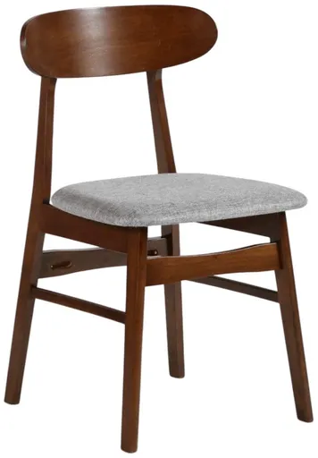 The New Classic Morocco Dining Chairs are a picture of Mid-Century Modern design with tapered legs, curved oval seatbacks, and classic walnut brown color. Easy care, light gray 100% polyester foam cushions provide comfortable seating. A perfect accent chair in any room.