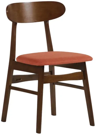 The New Classic Morocco dining chairs are a picture of mid-century modern design with tapered legs, curved oval seatbacks, and classic walnut brown color. Easy care, orange 100% polyester foam cushions provide comfortable seating. A perfect accent chair in any room.