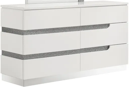The Paradox Six Drawer Dresser in white combines contemporary appeal with robust functionality. Its gleaming white gloss laminate finish offers a sleek, modern look while providing the practical benefits of scratch and water resistance. Crafted from a combination of solid and manufactured woods, this dresser ensures long-lasting durability.