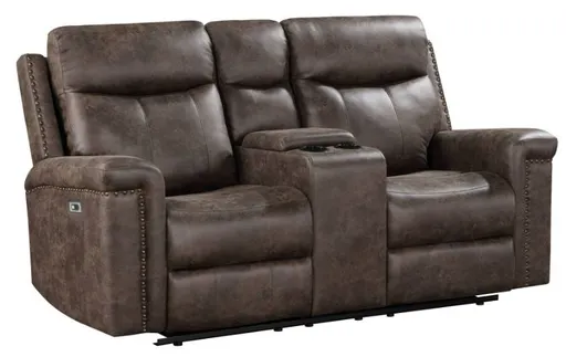 The Quade Power Dual Reclining Console Loveseat in mocha brown combines durability, comfort, and modern convenience. Built on a sturdy frame of premium hardwood, plywood, and engineered wood, this loveseat is designed to provide long-lasting support.