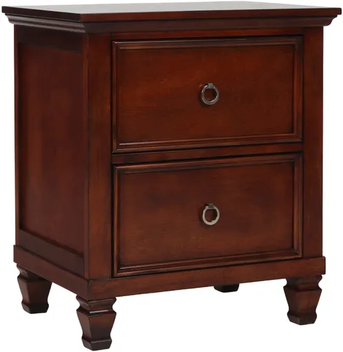 The Tamarack 2-Drawer Wood Nightstand in brown cherry combines durability with elegance. Built with solid poplar, basswood veneers, and eco-friendly manufactured wood, this nightstand ensures strength and long-lasting durability. Its versatile transitional design seamlessly blends contemporary clean lines with classic paneled detailing, creating a perfect harmony of modern and traditional aesthetics.