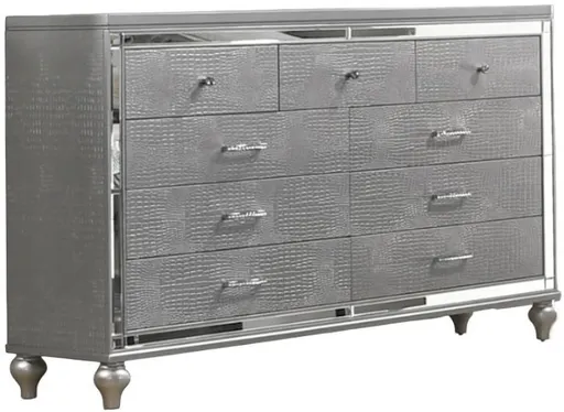 Discover the Valentino 9 Drawer Dresser in timeless Silvera marvel of durable craftsmanship crafted from a blend of manufactured and solid woods, adorned with exquisite embossed inlays. Radiating with glitz and glam, its gleaming finish, mirrored trims, crystal-studded drawer pulls, and alligator-embossed accents capture the essence of Hollywood allure.