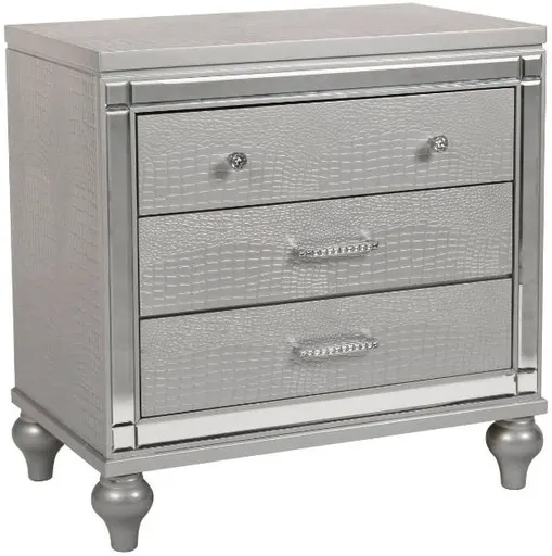 The Valentino 3-Drawer Nightstand in Silver is a luxurious addition to any bedroom. Crafted from a blend of manufactured and solid woods, it is built to last while maintaining its distinctive appeal.