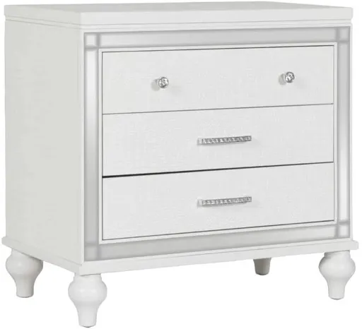 The Valentino Nightstand in white is a luxurious addition to any bedroom. Crafted from a blend of manufactured and solid woods, it is built to last while maintaining its distinctive appeal. Its glamorous design includes a gleaming White finish, mirrored trims, crystal-studded drawer pulls, and alligator-embossed inlays, embodying the essence of Hollywood glamour.