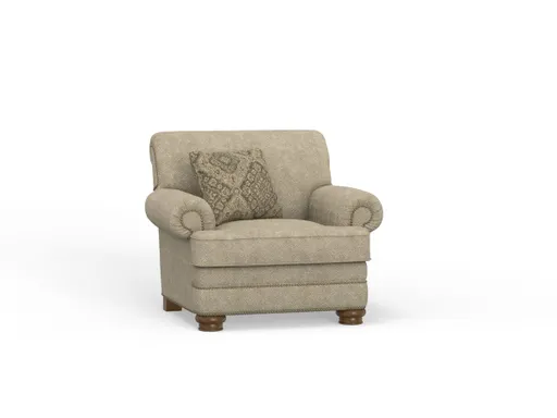 The Paloma Chair brings a touch of timeless elegance to any living space with its traditional design and refined details. Upholstered in a soft cream-colored fabric, this stationary living room chair features classic rolled arms and a delicate nailhead trim that adds a subtle, sophisticated accent. The turned bun legs further enhance its traditional charm, creating a piece that is both stylish and comfortable. A plush throw pillow is included, offering an extra layer of coziness and completing the look. Made in the USA, the Paloma Chair is a testament to quality craftsmanship and enduring style.