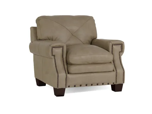 The Pilot Pebble Leather Chair is a statement of refined elegance and comfort, designed to enhance your living space. Upholstered in light brown top grain leather, this chair exudes a luxurious and timeless appeal. The addition of nailhead trim along the edges adds a touch of sophistication, elevating the overall aesthetic. The square-designed rolled arms provide a classic silhouette, while the pillow back with x detailing ensures both style and comfort. Whether used as a standalone piece or as part of a coordinated set, the Pilot Pebble Leather Chair brings a sense of warmth and sophistication to your home. Elevate your living room with this exquisite chair, where quality craftsmanship meets elegant design.