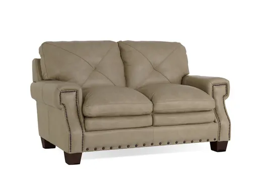 The Pilot Pebble Leather Loveseat is a refined and inviting addition to your living space, offering comfort and style for two. Upholstered in light brown top grain leather, this loveseat exudes a sense of luxury and durability. The nailhead trim along the edges adds a touch of sophistication, enhancing the classic design. Square-designed rolled arms contribute to the timeless silhouette, while the pillow back with x detailing ensures a comfortable and visually appealing seating experience. Perfectly sized for two, the Pilot Pebble Leather Loveseat is an ideal choice for cozy conversations or shared relaxation. Elevate your living room with this loveseat, where the combination of quality craftsmanship and elegant design creates a harmonious and inviting atmosphere.