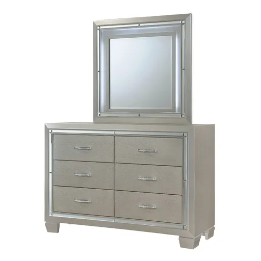 The Platinum Dresser and Mirror set is a stunning and glamorous addition to any youth bedroom, combining chic design elements with functional storage. Crafted from engineered wood, this set features embossed drawer fronts that add texture and depth to the furniture. The champagne color adds a touch of sophistication. Enhancing its luxurious appeal, the dresser and mirror are adorned with shiny mirror trim that provides a reflective surface and contributes to the overall stylish aesthetics. The crystal-accented handles on the six drawers add a touch of elegance and sparkle. The mirror in this set goes beyond the ordinary with its illuminated feature, adding a soft and ambient light to the dressing area. The Platinum Dresser and Mirror set is a perfect blend of style and practicality, creating a glamorous and functional space for any youth bedroom.