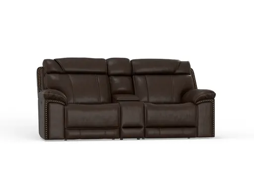 The Ravenna Console Leather Loveseat offers a blend of luxury and practicality for your living space. Upholstered in rich brown leather, this loveseat features triple power with Zero Gravity recline, heat and massage functions, and a wireless remote for ultimate comfort. It is crafted with top-grain leather on the seating areas and durable vinyl on the sides and back, ensuring both elegance and durability. The loveseat is adorned with nailhead trim, adding a sophisticated touch. Additionally, the console includes storage and cup holders, along with USB Type C and Type A ports to keep your devices charged and within reach. This loveseat is the perfect choice for those seeking comfort, style, and modern functionality.