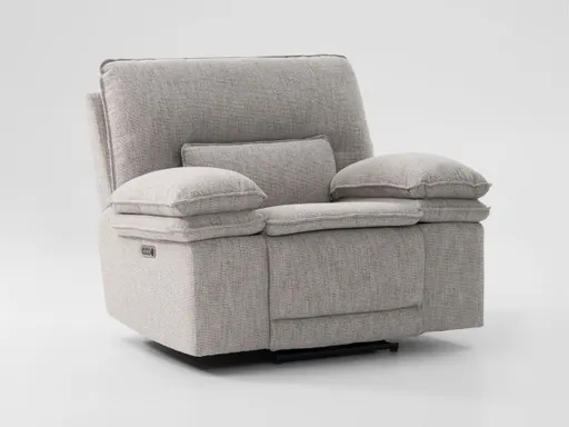 The Renegade Power Recliner combines style and comfort with its beige fabric upholstery, tall back, and deep seat, creating a relaxing retreat in any living room. This transitional-style recliner features plush pillow-top arms, and a power reclining mechanism allows you to adjust for the perfect lounging position. Power buttons on the side include USB ports, making it easy to keep devices charged while you unwind.