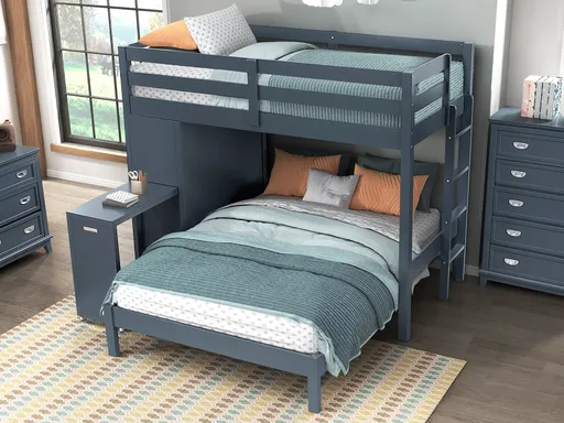 The Sabrina Twin/Full Loft Bunkbed is a smart, space-saving solution designed to meet the needs of growing kids and teens. Finished in a bold navy tone, this twin-over-full loft bed blends practical storage and modern style into one compact design. Crafted from wood and engineered wood for lasting durability, it features a top twin bunk with secure guard rails and a full-size lower bunk, offering flexible sleeping arrangements for siblings or guests. Its rich finish and clean lines make it a stylish centerpiece in any youth bedroom.