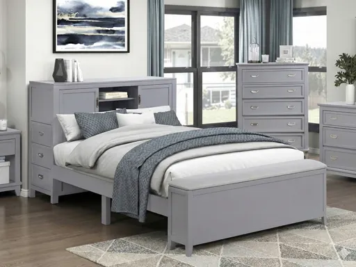 The Samuel Twin Bookcase Platform Bed is a sleek and modern solution for maximizing space in any bedroom, especially where smart storage is a must. Finished in a clean, contemporary gray, this bed is crafted from wood and engineered wood for strength and stability. The built-in bookcase headboard offers convenient open storage and three dovetail drawers, perfect for keeping books, chargers, or personal items organized and within reach. Polished nickel-tone flush ring pulls add a stylish accent to the bed’s streamlined design.