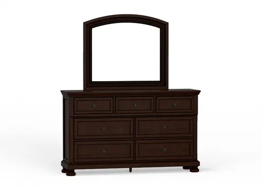 The Sophie Dresser and Mirror set combines classic elegance with functional storage, creating a refined focal point for your bedroom. Crafted from poplar and pine solids with cherry veneers, it features a rich dark brown finish that highlights the wood’s natural warmth and grain. The dresser offers a timeless design complemented by the large matching mirror, which has a gently arched top that adds a touch of graceful sophistication.