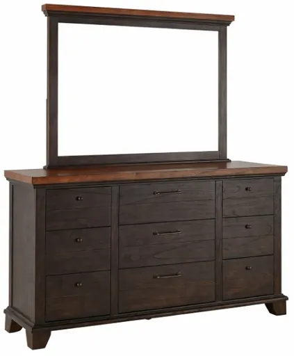 A rustic, farmhouse-inspired bedroom, Bear Creek features a sable finish that contrasts beautifully with caramel stained tops and cap rails. The chevron patterned drawer fronts are a stylish addition to the antiqued pewter finish hardware. Deep drawers offer plenty of storage for bulky items like sweaters. The Dresser is paired here but can also be used alone.