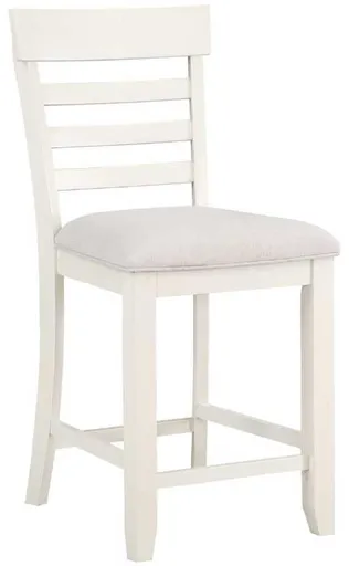 An upholstered Counter Chair that sports a crisp white finish and cream-colored fabric seat for a fresh, comfortable addition to any kitchen or dining area. The horizontal slatback design features a shaped top rail for a relaxed transitional appeal for modern, farmhouse or coastal environments.