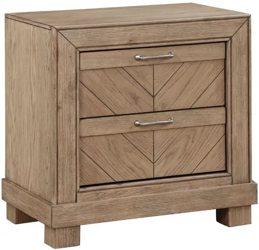 A wonderful bedside companion in weathered sand with satin nickel hardware, the Montana Nightstand stores all essentials within easy reach of the bed. Two drawers feature have safety stops and are fully extendible to maximum storage space within the Nightstand. Chevron fronts add a simple design that adds detail to the weathered sand exterior.