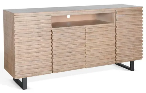 The boxy silhouette and two sled legs will give your living room a mid-century modern vibe. It has two side cabinets with adjustable shelves and two smaller cabinet doors to fit all your necessities. The open shelf is perfect for a sound bar with cord management.