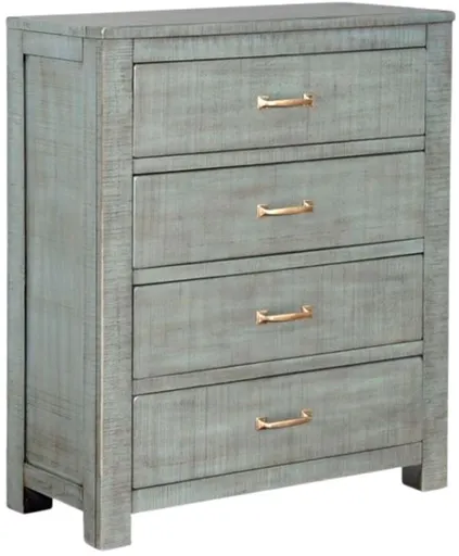 Crafted with the same precision and attention to detail, this chest seamlessly complements the rustic charm of Rough Sawn Mahogany solids and veneers. The textured blue finish adds character, creating a cohesive look within the collection. Each of the four drawers offers ample space to neatly organize and store your belongings.