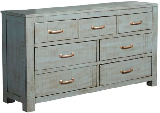 Crafted with meticulous attention to detail from Rough Sawn Mahogany solids and veneers, this dresser radiates rustic elegance. The textured blue finish maintains a cohesive aesthetic within the collection, while the distinctive design showcases four large drawers for spacious storage alongside three smaller organizing drawers for meticulous order.