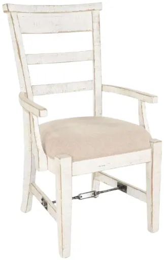 This sturdy Marina dining arm chair was built with distressed mahogany solids. The turnbuckle accents add a rustic touch. Elevate your room design by incorporating this dining chair into your room.