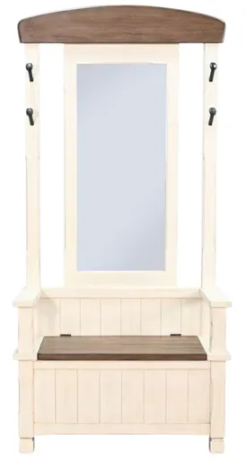 Enhancing the functionality and aesthetics of any entryway or mudroom, the Pasadena Buckskin/Marble White Hall Tree stands out as the perfect addition. Its large mirror not only serves a practical purpose. The unique railroad spike hangers provide a distinctive and stylish element, contributing to the overall charm