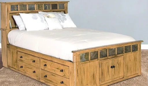 The Sedona bedroom set has been built with distressed mindi solids and veneers, full extension ball bearing drawer guides and genuine slate accents. Available as panel bed or bookcase storage.