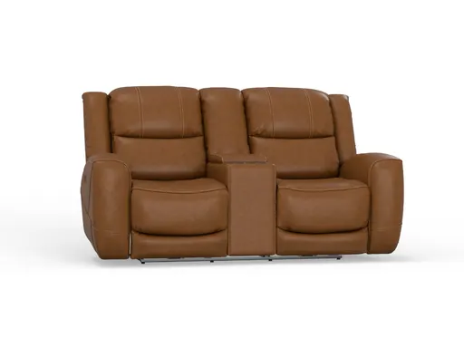 The Toffee Power Leather Loveseat combines style and functionality with its top-grain warm brown leather and durable vinyl on the sides and back. It features power recline and power headrest options, allowing for ultimate comfort. The power buttons on the side include USB-A and USB-C ports for easy device charging. This loveseat also boasts a practical storage console in the middle, complete with three cupholders, making it perfect for relaxing in style. With a 325lb weight capacity, it is both sturdy and inviting.