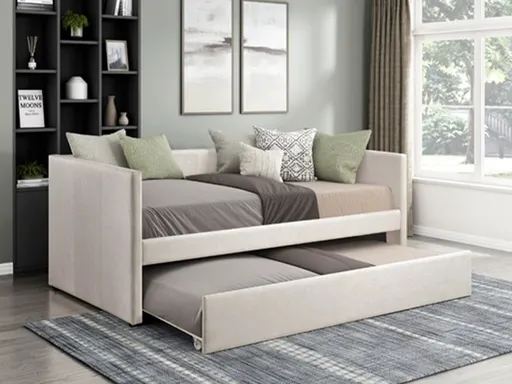 Maximize both style and functionality in your space with the Tucker Twin Daybed with Trundle. Featuring a clean modern design and soft upholstered finish, this piece easily transitions from a comfortable seating area by day to a practical sleeping solution by night.