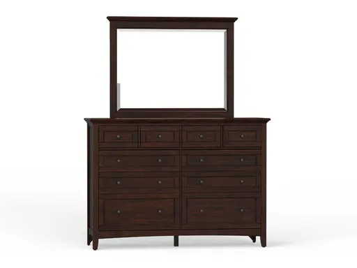 The Tuttle Dresser and Mirror set offers a blend of timeless elegance and smart storage, crafted to elevate any traditional bedroom space. Made from solid mahogany and finished in a rich cherry brown, the dresser showcases traditional styling with framed detailing and clean lines that highlight the wood’s natural beauty. Topped with a large framed mirror, the set brings both function and depth to your room, making daily routines easier while adding visual openness.