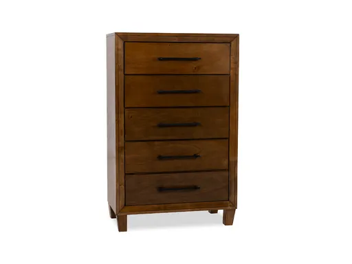 The Woodward Chest brings functional storage and classic design to any bedroom with its warm walnut finish and durable craftsmanship. Made from brown rubberwood and Okoume veneers, this five-drawer chest showcases a multi-step finish that enhances the natural beauty and depth of the wood grain.