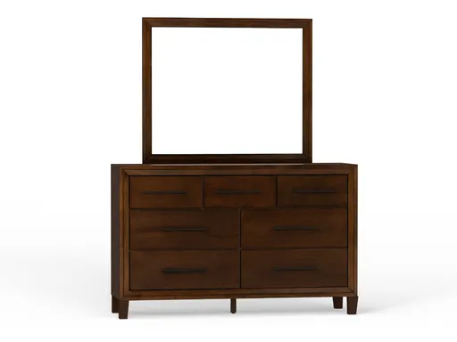 The Woodward Dresser and Mirror set offers classic elegance and practical storage for any bedroom. Crafted from brown rubberwood and Okume veneers, this set features a warm walnut finish achieved through a meticulous multi-step process that enhances the depth and richness of the wood grain.
