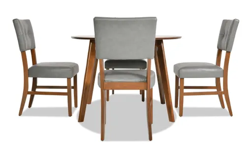 Looking to spice up your dining space? Add a pop of mid-century modern style with my compact set. The faux leather upholstery and flared legs give off retro vibes, while the Bob-O-Pedic Memory Foam seats add modern comfort! Set includes: round dining table and 4 chairs