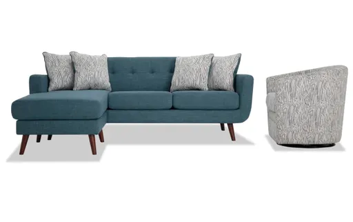 My Bettie Chofa & Swivel Chair are a couple of mid-century modern beauties! Made of 100% polyester, this contemporary chofa sports a tufted seat back, understated track arms and slender, slightly flared wooden legs. The best part is the chaise portion can be moved to either the right or left-hand side! Add in a comfy layer of my famous Bob-O-Pedic Memory Foam along with four trendy accent pillows and you're ready to sit in comfort - and style, of course! Meanwhile, the chair has a swivel function so you'll never have to miss a conversation!