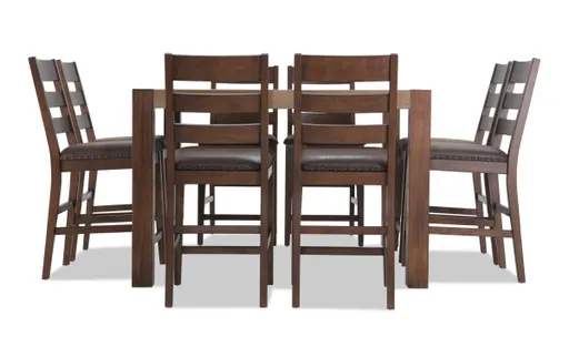 Embark on a dining adventure Give your dining space some height and comfort with my Canyon set. The multi-tone wood table and Bob-O-Pedic Memory Foam pair perfectly with rustic food and good company! Set includes: counter height square table and 8 ladder back stools