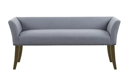 Accent your home with the simple elegance of my Cecile Bench. Upholstered in a slate blue fabric, this bench features a low back and flared arms that create a sleek and sophisticated look. A bronze nailhead trim adds elegant accent, while the light wood finish complements the upholstery.
